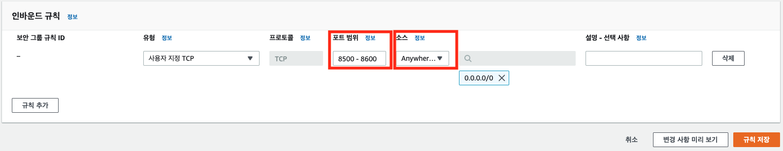 - 포트 범위는 8500-8600 으로 입력, 소스는 Anywhere-IPv4 로한다.