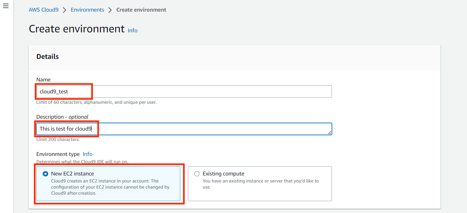 - Name과 Description을 입력해준다. Environment type에 New EC2 instance와 Existing compute 두 개의 선택 사항이 있는데 기존의 연결할 EC2가 있는 경우 Existing compute를 선택. 그렇지 않고 새로운 EC2를 만들고 연결할 경우 New EC2 instance를 선택한다. 우리는 새로운 EC2를 생성해보자.
