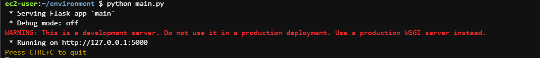 작성을 하고 Cloud9 terminal에서 python main.py로 실행을 해주면 아래와 같은 error 메시지를 볼 수 있는데 당연히 안될것이 우리는 EC2의 보안그룹에서 인바운드 규칙을 아무것도 적용해주지 않았기 때문이다.