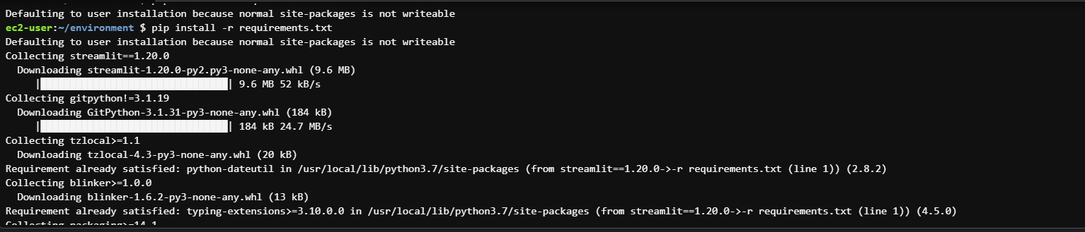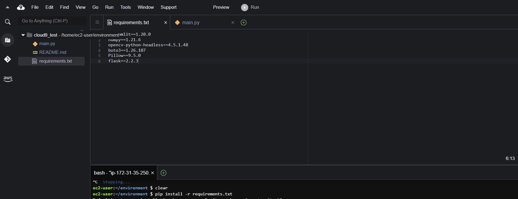 - Cloud9으로 접속 후 requirements.txt 파일을 만들고 필요한 라이브러리를 입력해 준다.