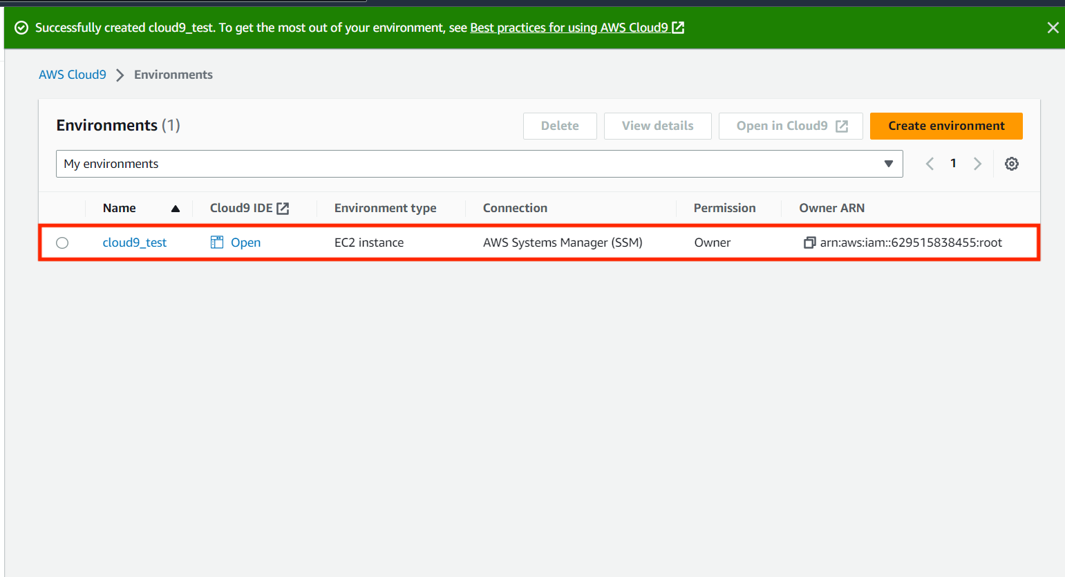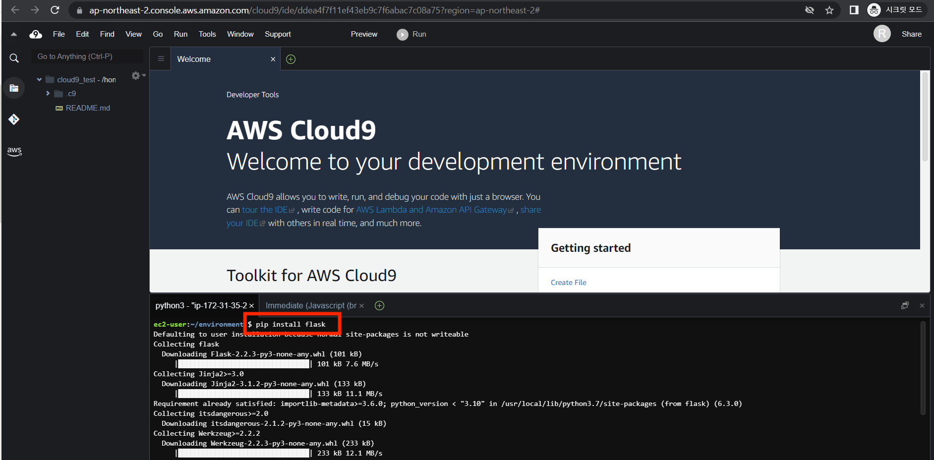 - 방금 만들었던 cloud9_test가 성공적으로 만들어졌다.