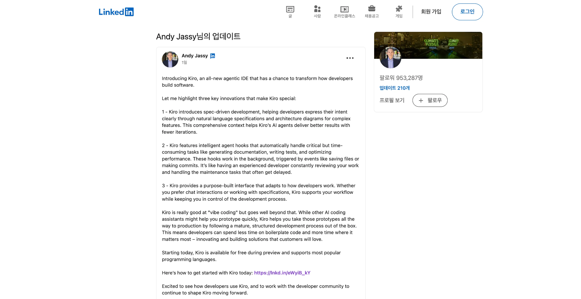 불과 어제, 아마존의 CEO 링크드인 포스트로 Kiro가 공개되었습니다. 아래는 포스트의 요약입니다.
