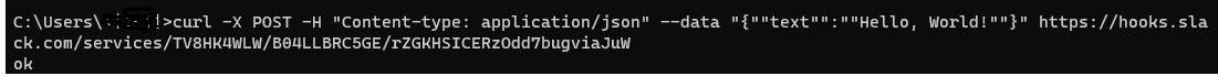 "Content-type:application/json" --data "{""text"":""Hello, World!""}" 형식으로 바꿔주면 다음과 같이 ok를 출력하며