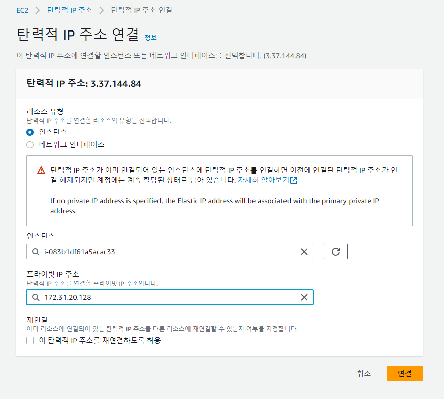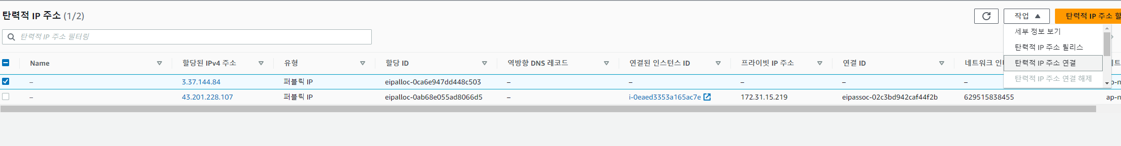 생성된 IP를 클릭후 작업에서 탄력적 IP 주소연결 클릭.