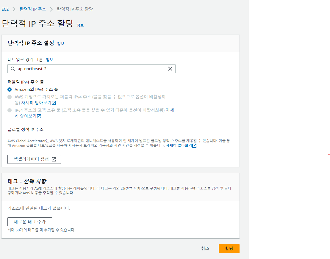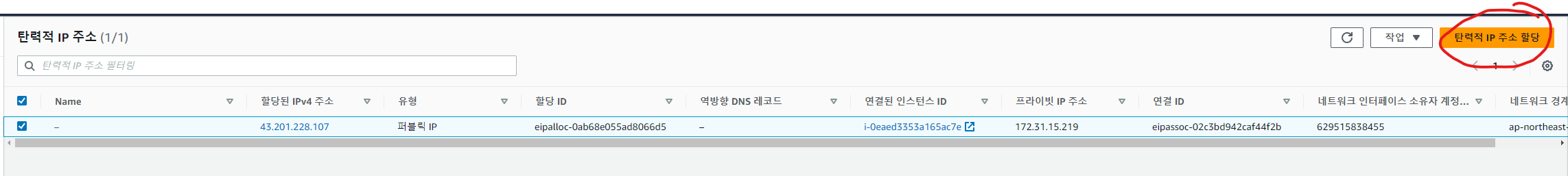 내가 사용하는 인스턴스의 지역을 잘 확인하고 할당을 클릭.
