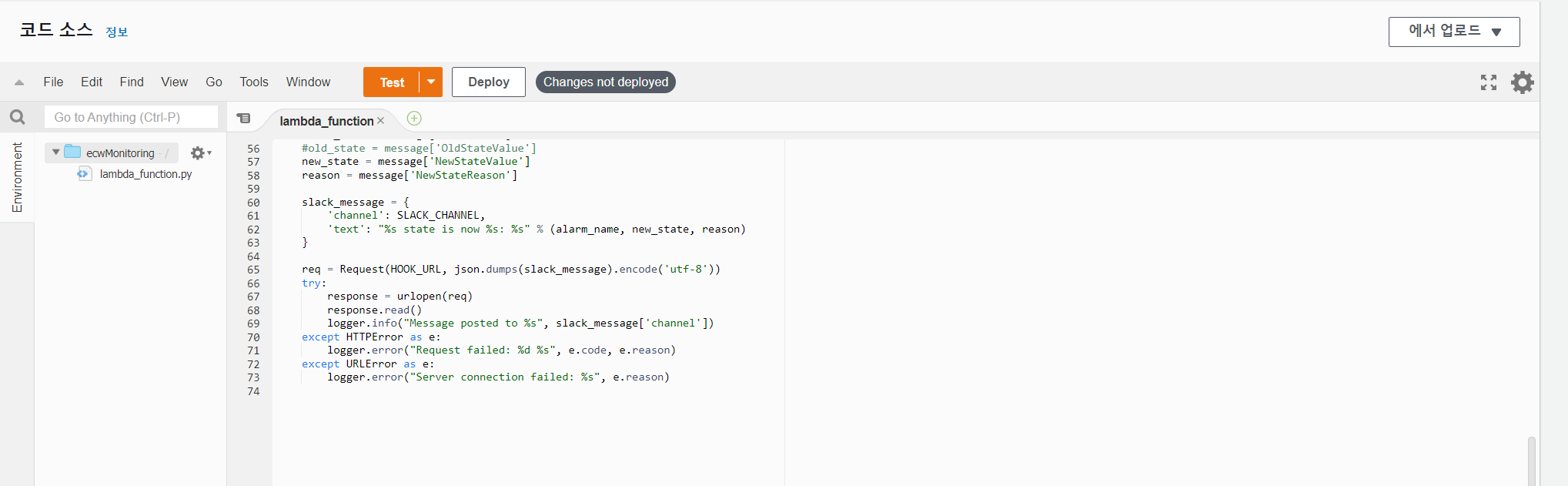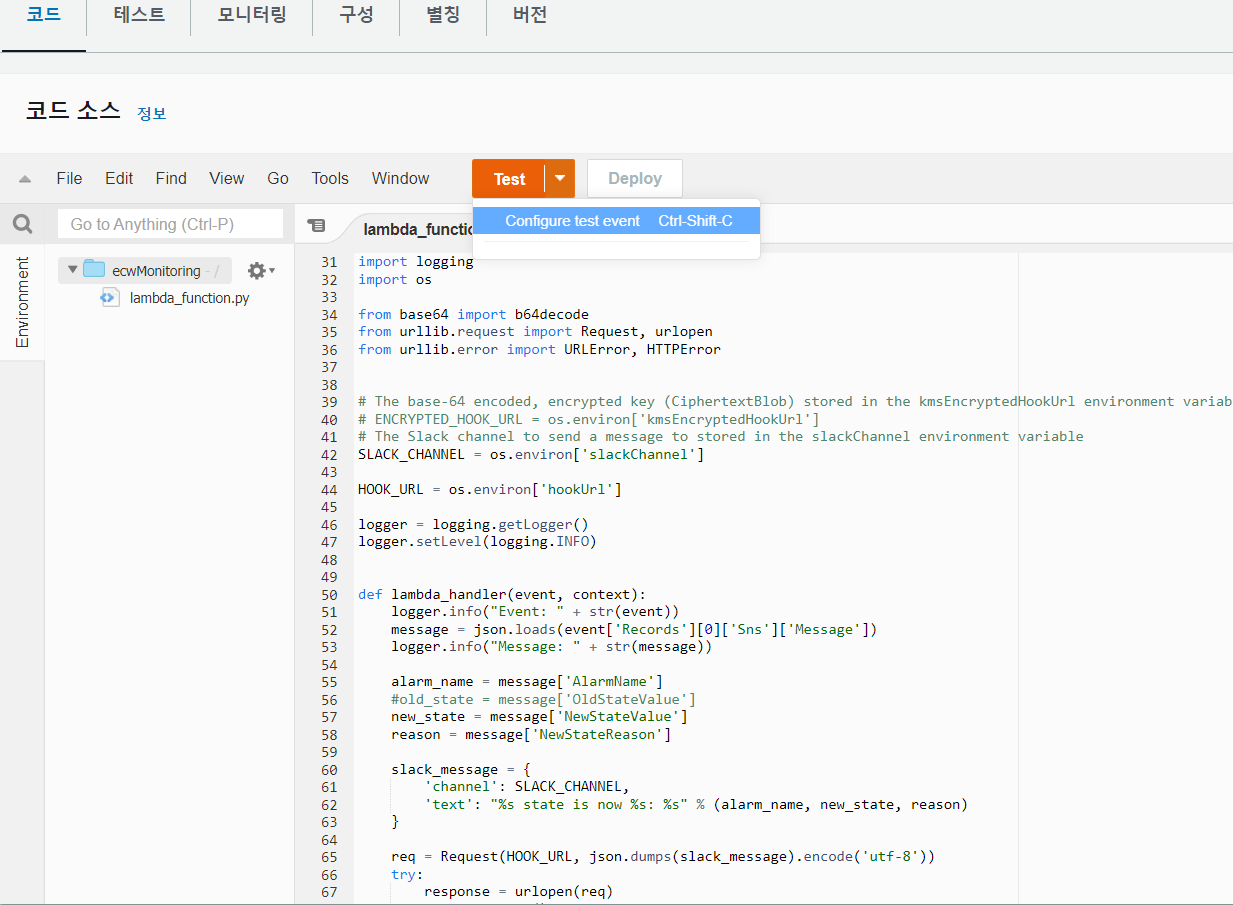 우리는 KMS 암호화를 적용하지 않을 것이고 직접 hookUrl을 사용하기 때문에 아래와 같이 코드를 변경한다.