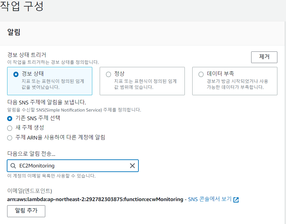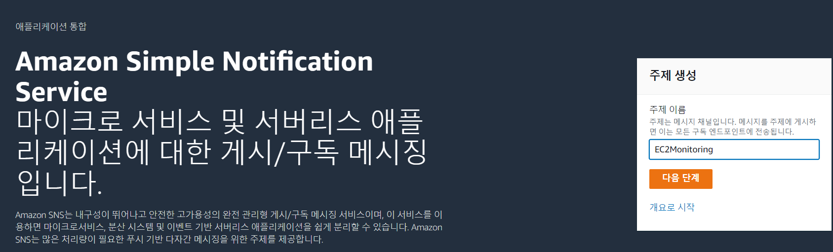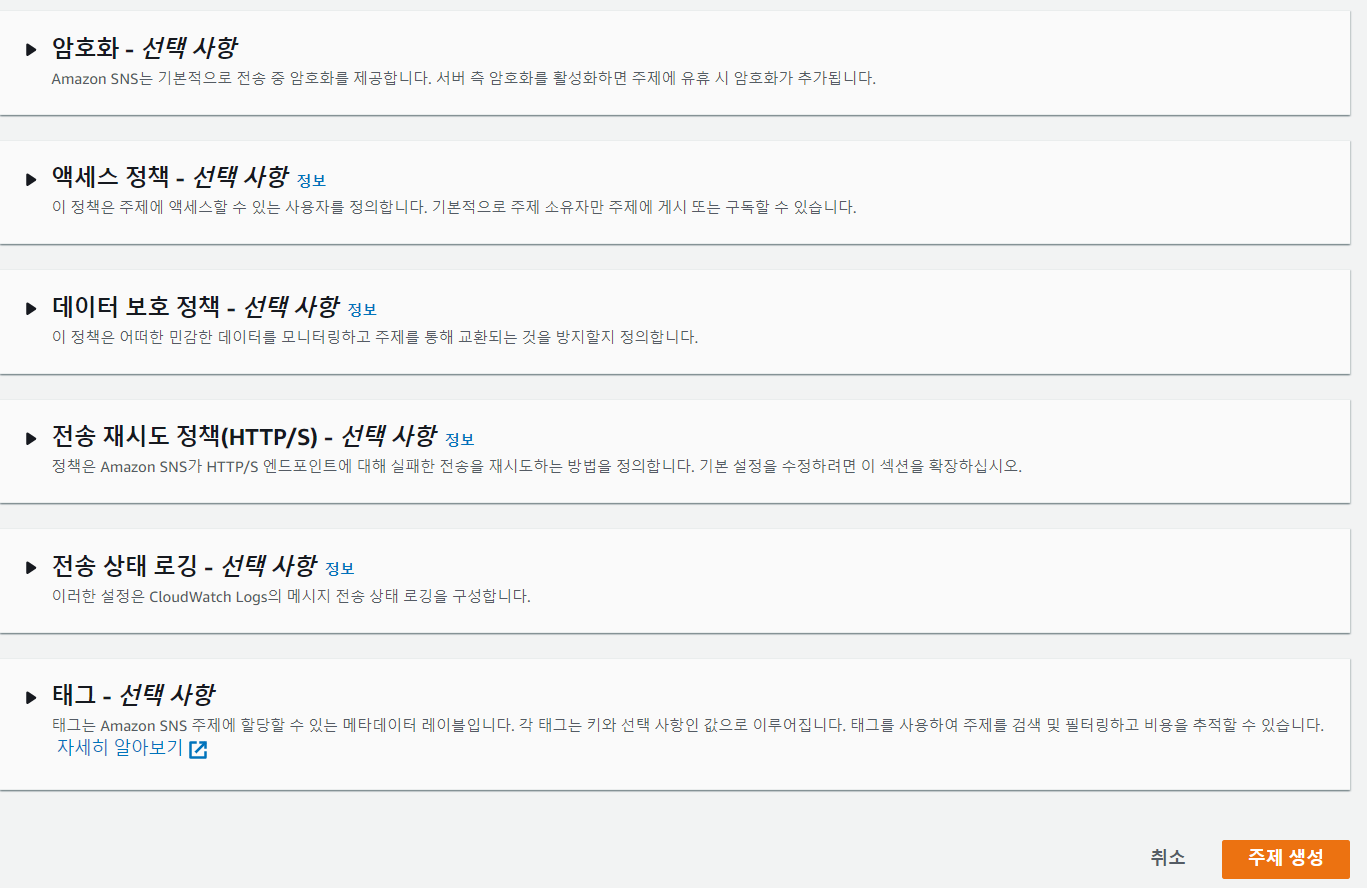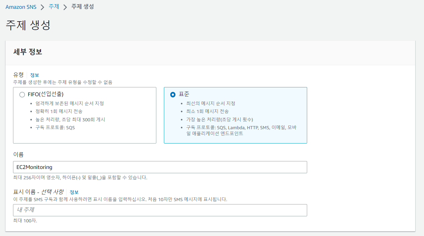 제일 먼저 해야할 일은 SNS(Simple Notification Service)에서의 주제 생성이다.