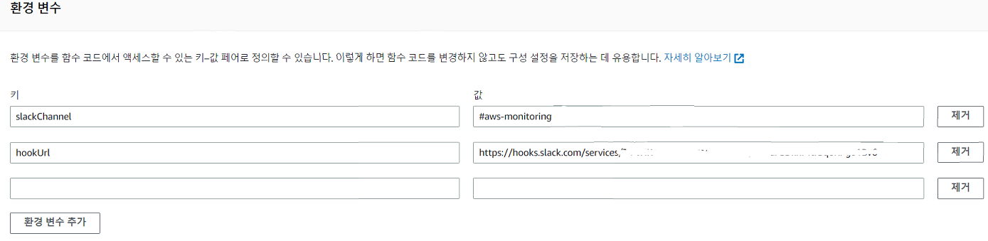 그렇기 떄문에, 환경변수의 kms*의 값을 지우고 hookUrl 이라는 환경 변수를 생성 할 것이다.!