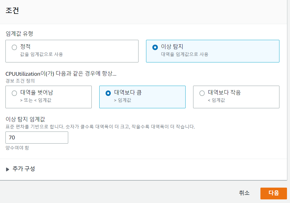 70%이상 사용률만 체크하게 구성했다. 이제 다음을 누르면 작업 구성을 계속해서 진행한다.