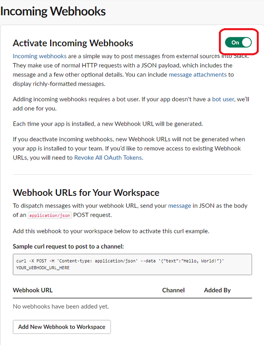 다음 화면으로 이동하면 아래의 사진 처럼 off를 on으로 바꿔주고 맨아래의 Add New Webhook to Workspace 클릭!