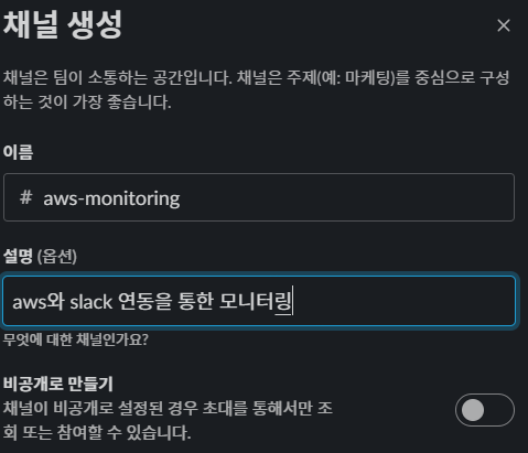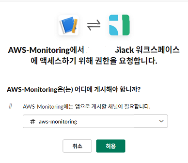 이제 아래의 화면 처럼 넘어오게 되는데, 앞서 생성해둔 채널로 설정한 뒤 허용을 누른다(난 aws-monitoring 이다)