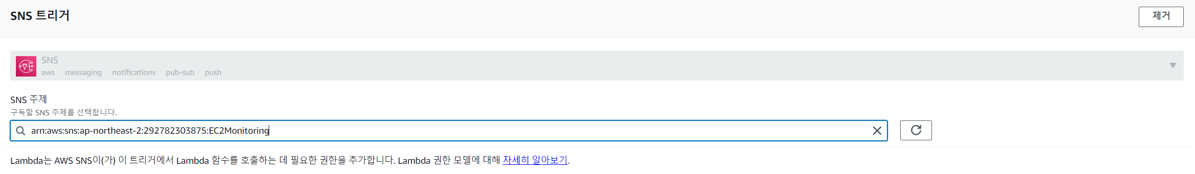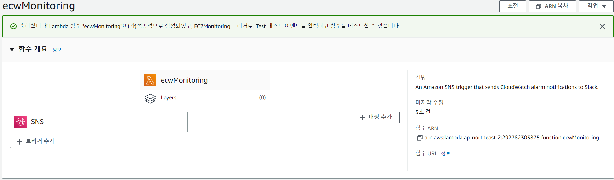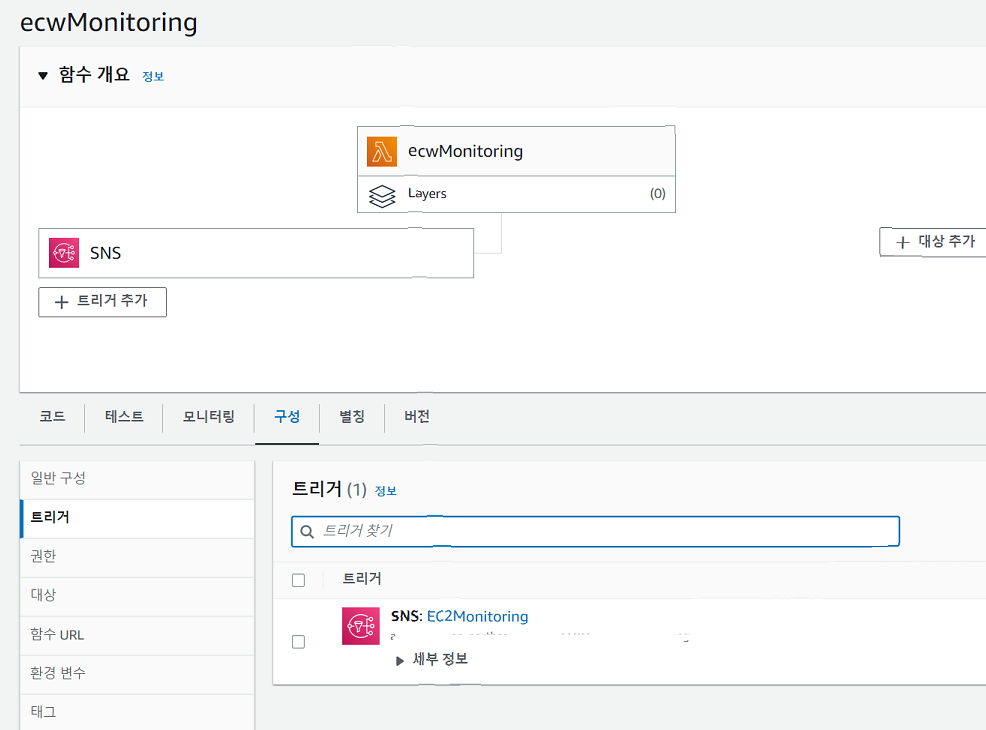 경보생성을 완료 한뒤 Lambda 콘솔로 돌아가서 SNS 트리거를 확인한다.