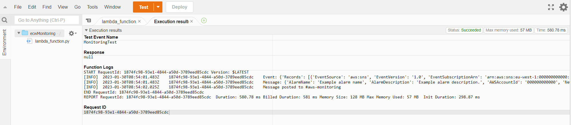 "Message": "{\"AlarmName\":\"Example alarm name\",\"AlarmDescription\":\"Example alarm description.\",\"AWSAccountId\":\"000000000000\",\"NewStateValue\":\"ALARM\",\"NewStateReason\":\"Threshold Crossed: 1 datapoint (10.0) was greater than or equal to the threshold (1.0).\",\"StateChangeTime\":\"2017-01-12T16:30:42.236+0000\",\"Region\":\"EU - Ireland\",\"OldStateValue\":\"OK\",\"Trigger\":{\"MetricName\":\"DeliveryErrors\",\"Namespace\":\"ExampleNamespace\",\"Statistic\":\"SUM\",\"Unit\":null,\"Dimensions\":[],\"Period\":300,\"EvaluationPeriods\":1,\"ComparisonOperator\":\"GreaterThanOrEqualToThreshold\",\"Threshold\":1.0}}",