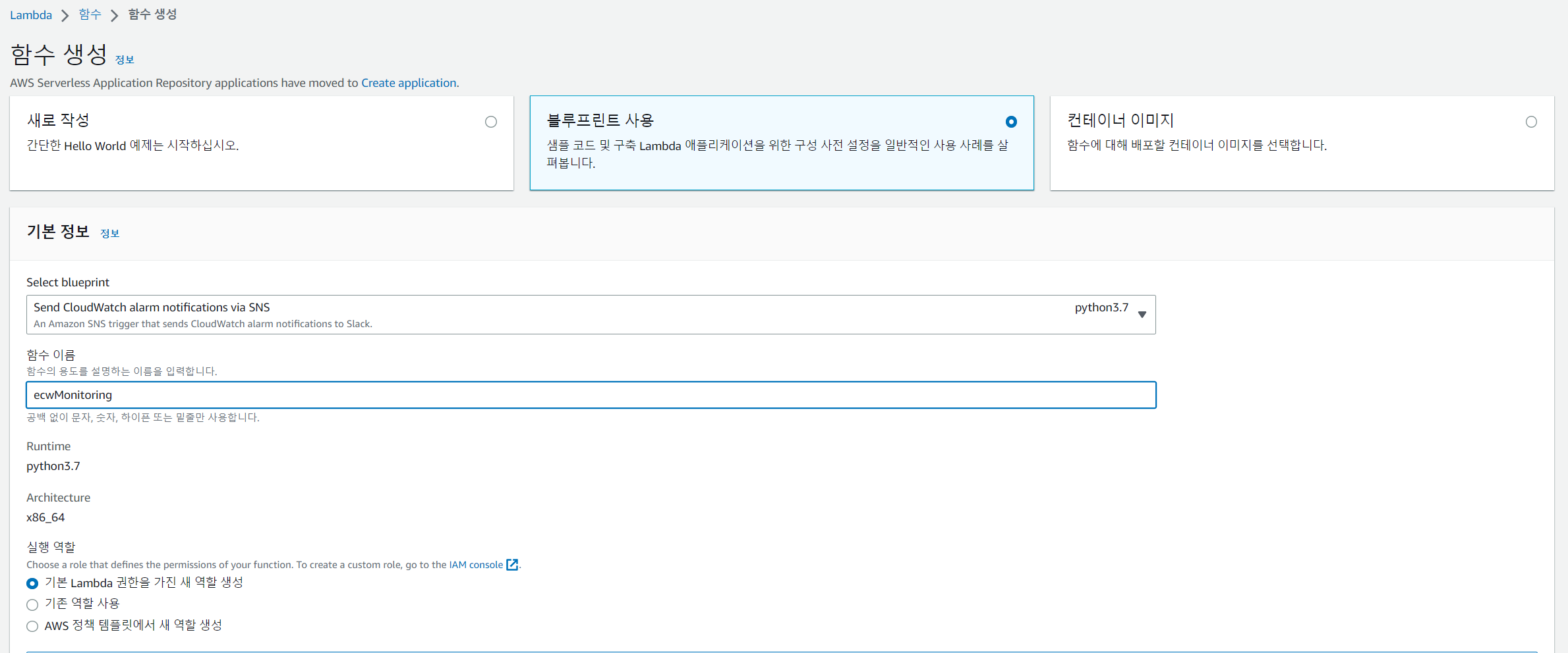 주제를 생성했다면, 이제 AWS Lambda 함수를 생성해야 한다. 여기서 부터 잘 따라와야 하는데,