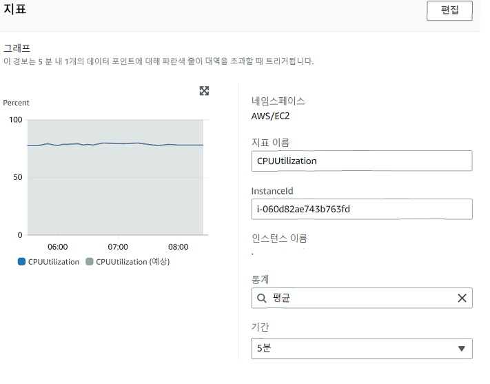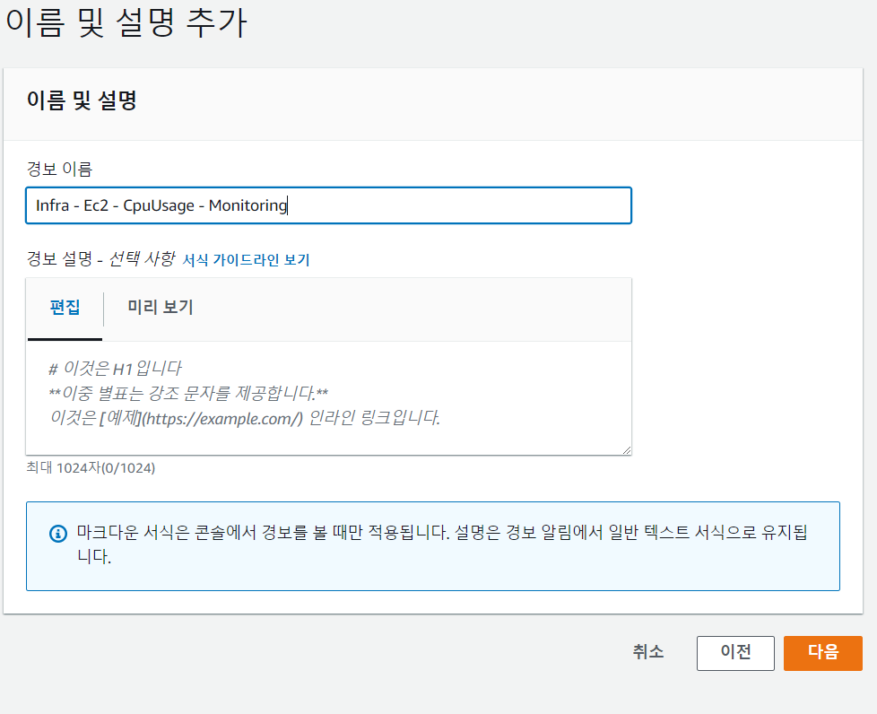 기존 함수를 알맞게 선택했다면, 다음으로 넘어가 이름 및 설명 추가 작업 등을 진행하고 경보를 생성한다.