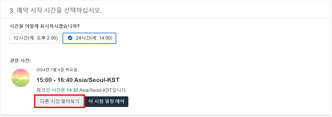 예약 시작 시간을 선택할 수 있는데, 다른 시간 알아보기를 누르면, 밑에 예약 시작 시간을 따로 정할 수 있다. (보이는 예시에는 많이 없지만, 다른 날을 잡으면 많이 있다는 것을 알 수 있다.)