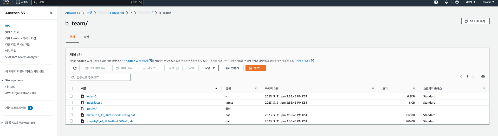 앞으로 해당 기능을 이용하여 앞으로 있을 elasticsearch& aws 프로젝트와 관련한 데이터를 s3에 스냅샷을 이용하여 저장할 예정이다. 다음에는 복원 관련한 블로깅을 진행해봐야겠다.