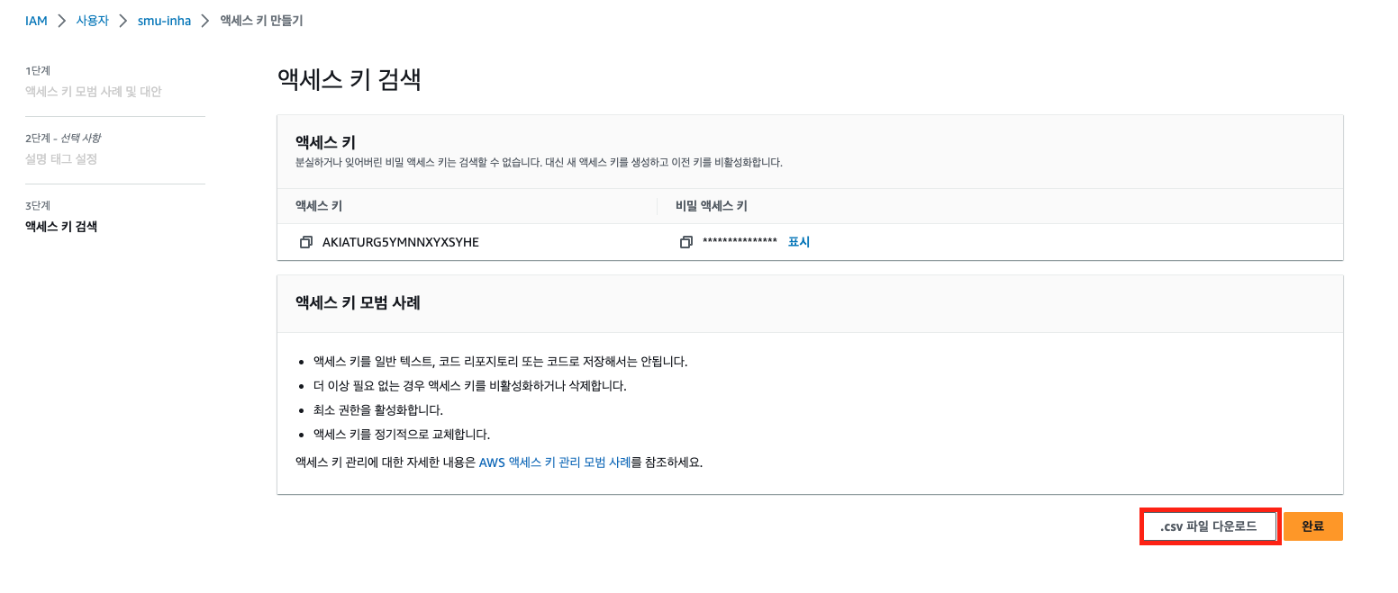 액세스 키를 만들고 csv 파일을 다운로드 받는다.(다운로드 꼭 받아놓기 .ᐟ.ᐟ)