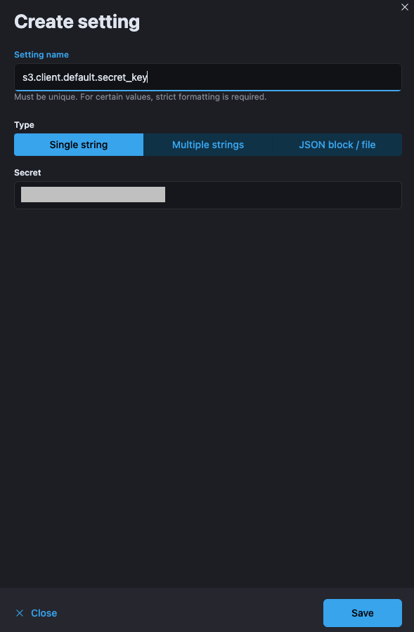 setting name을 s3.client.default.secret_key로 설정 후 csv로 다운받은 secret_key를 작성하여 등록하여 준다.
