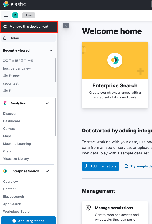 엘라스틱 클라우드에 접속하여 Manage this deployment를 클릭한다.
