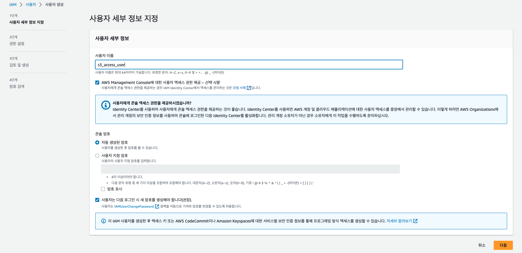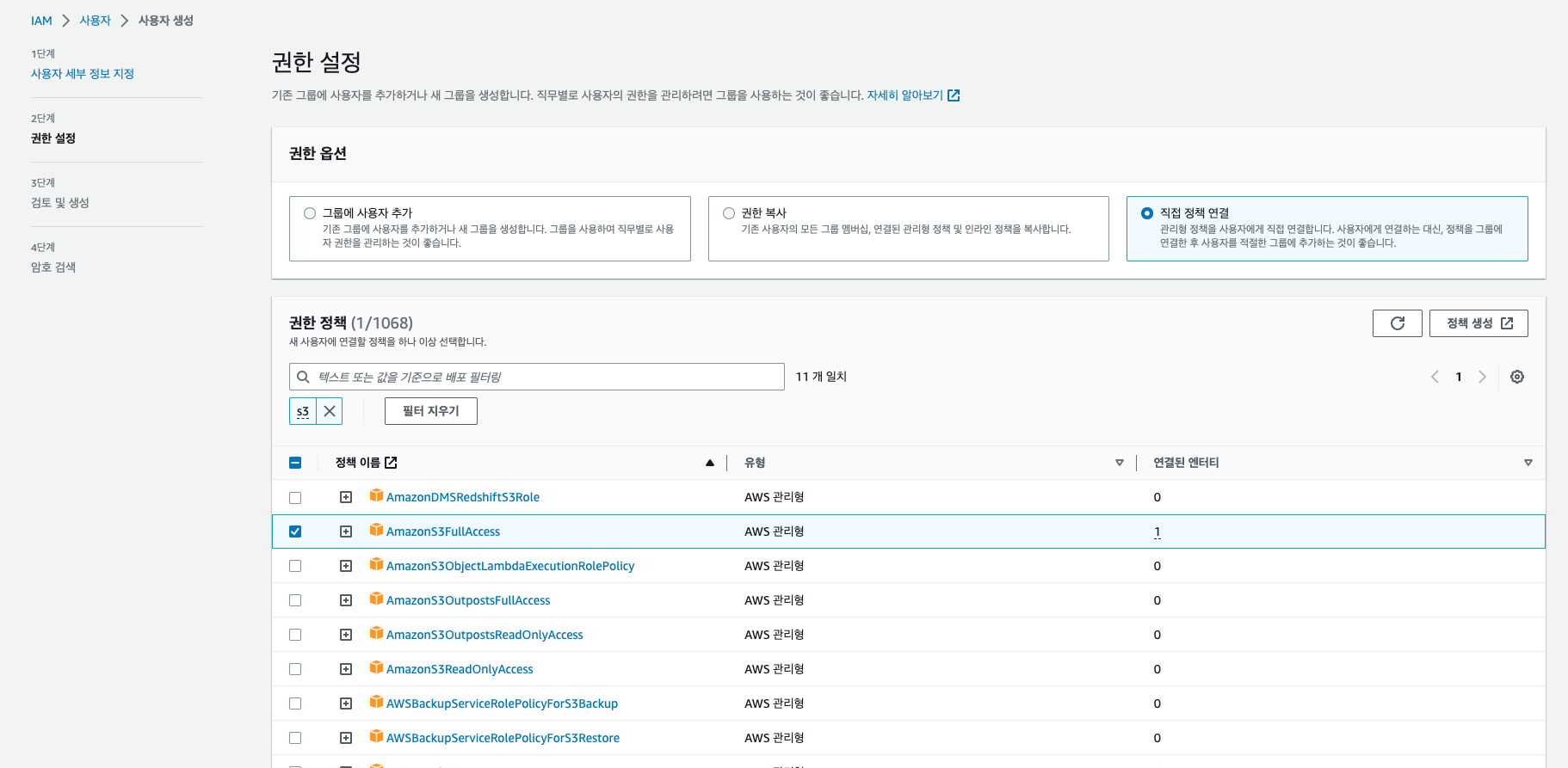 권한 옵션에서 직접 정책 연결 > AmazonS3FullAccess 를 추가하자.