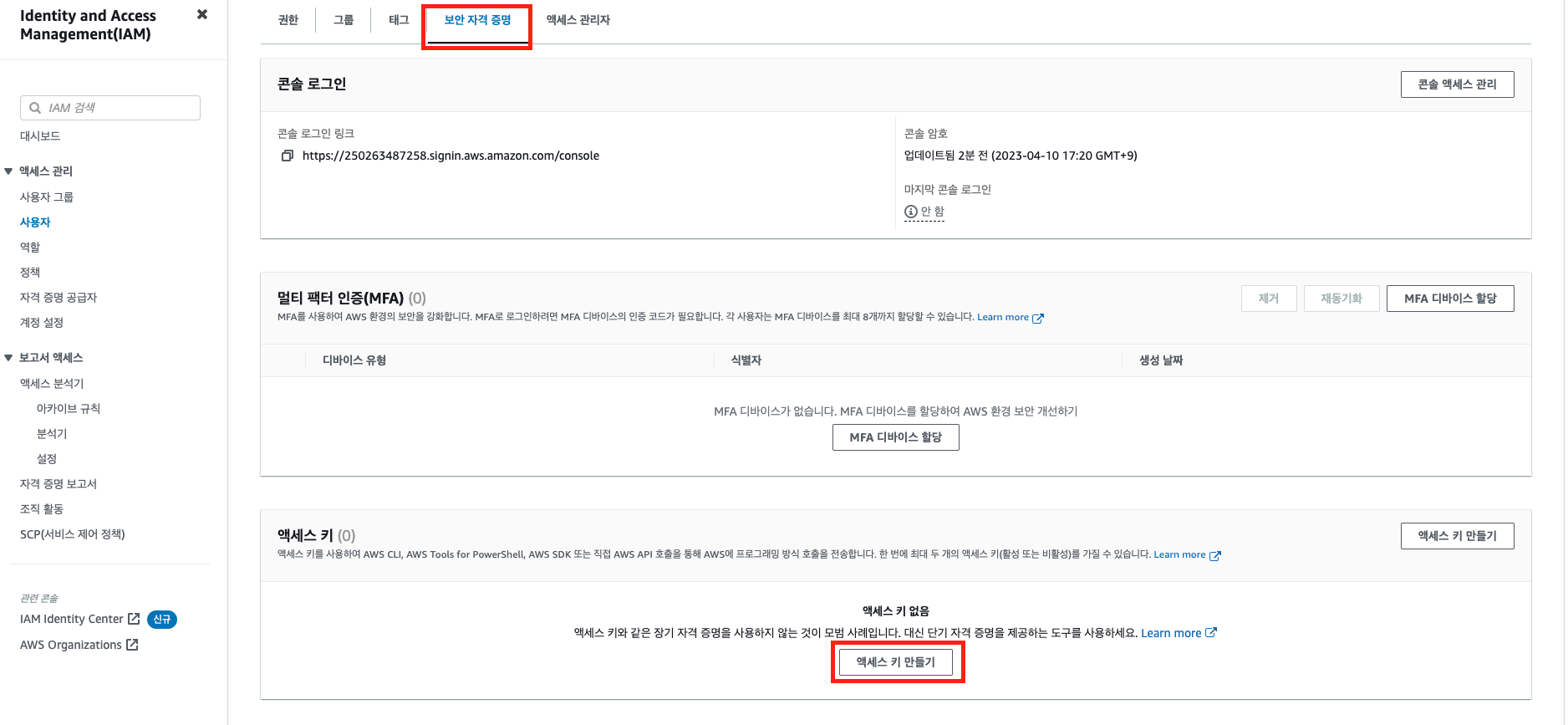 만들어진 해당 사용자의 액세스 키를 만들기 위해서는 사용자 > 보안 자격 증명> 액세스 키 만들기 를 선택한다.