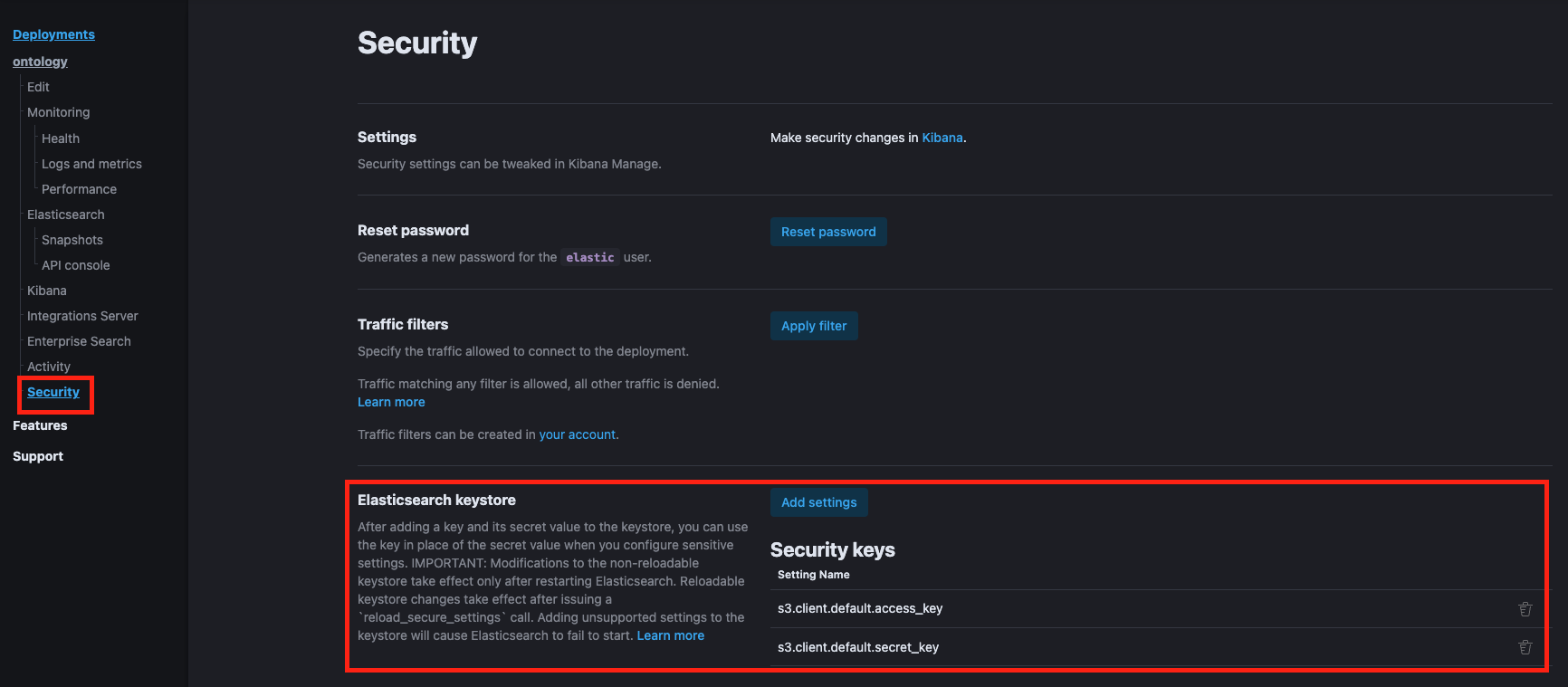 하지만 엘라스틱서치 클라우드상에서는 직접 elasticsearch-key store 에는 접근이 불가하다. (온프레미스 환경에서만 접근 가능)