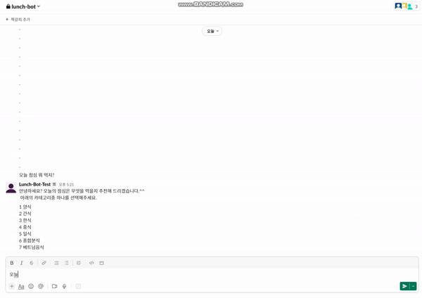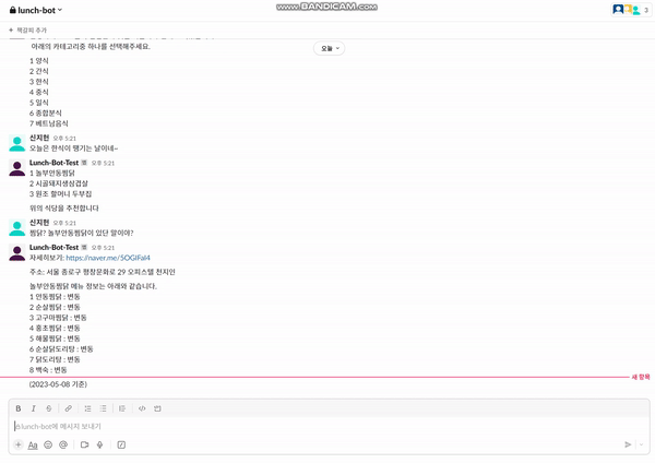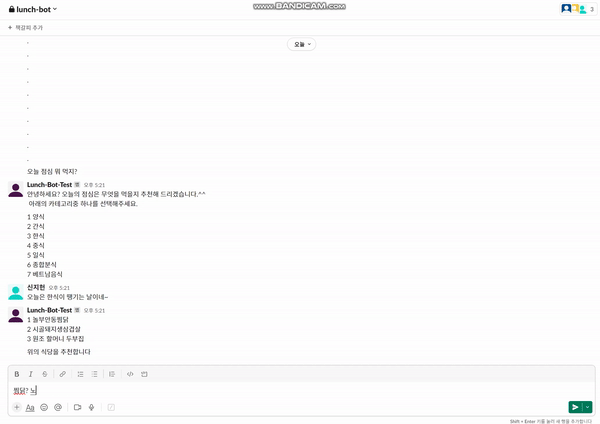 위의 모든 과정들이 이루어진 점심뭐먹지(런치봇)의 시연영상을 아래에 첨부한다.