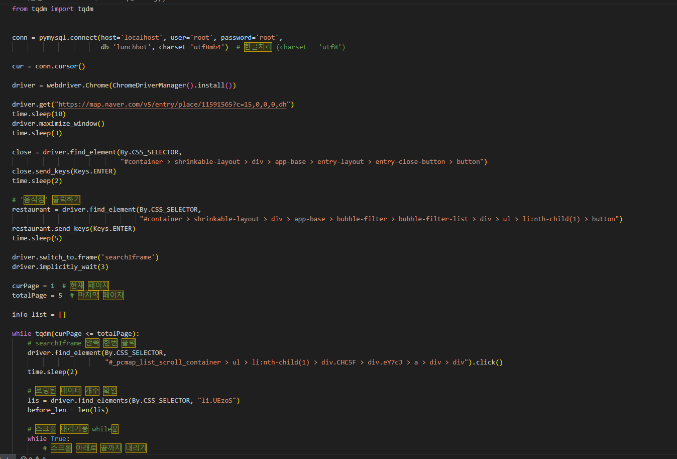 2번 네이버 지도의 맛집(여러 식당)을 크롤링 하기 위한 파이썬 코드 작성 인데 간단하게 만 소개하자면 아래와 같은 형식이다.